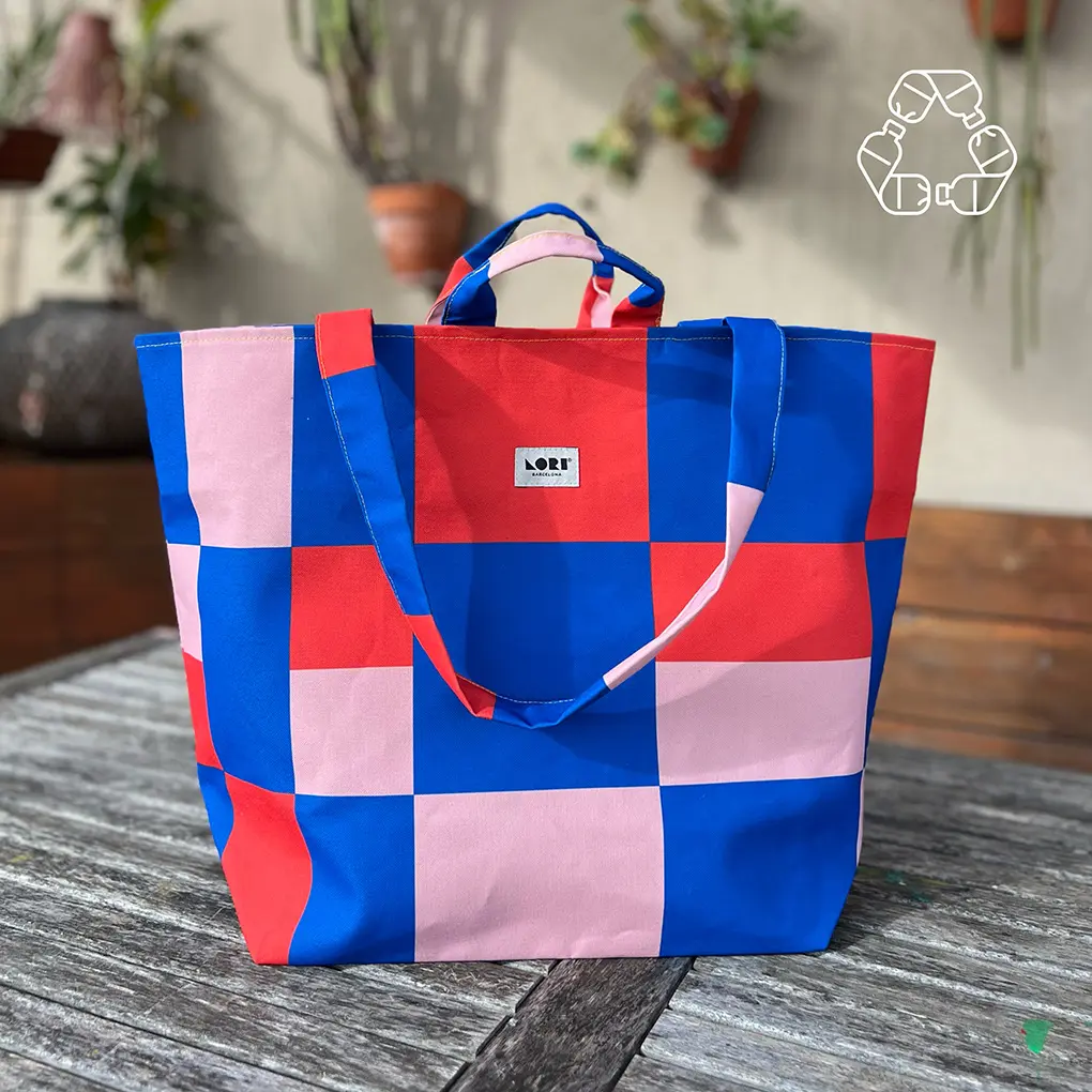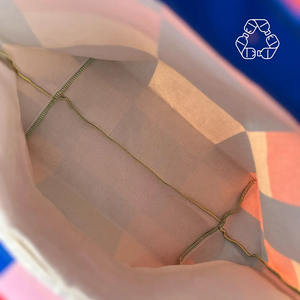 Descubre el estilo sostenible con nuestra bolsa de asas de diseño geométrico, perfecta para cualquier ocasión, desde la playa hasta eventos chic. Hecha con tejido reciclado de 9 botellas PET, combina elegancia y responsabilidad eco-friendly.