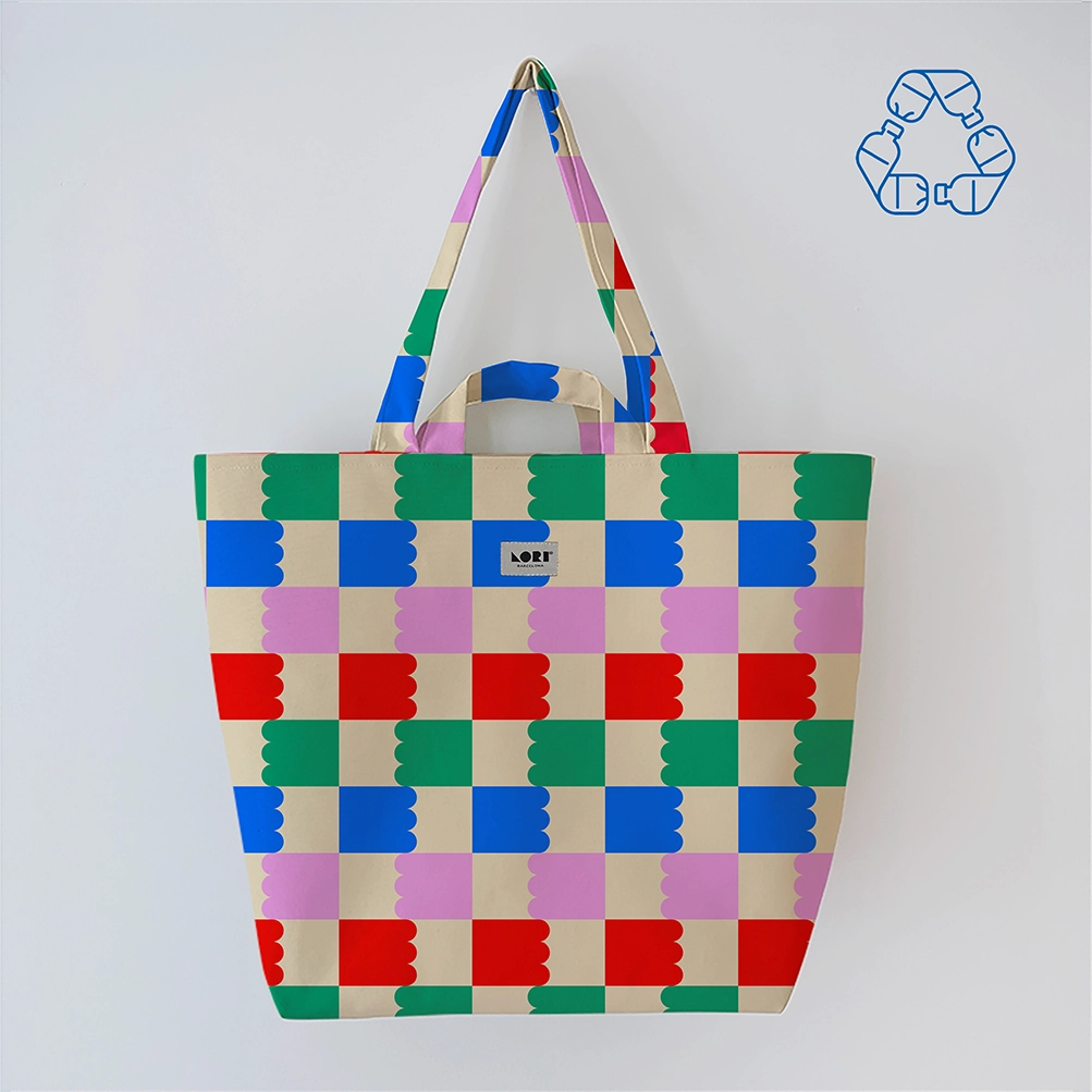 Fabricada a partir de materiales reciclados, esta tote bag de tamaño XL ofrece una gran capacidad sin perder ligereza. Su diseño gráfico en tonos rojo y rosa destaca por su carácter artístico: formas geométricas como círculos, cuadros y líneas curvas se entrelazan creando un patrón moderno y visualmente llamativo. El resultado es una bolsa única, con una estética cuidada hasta el último detalle.